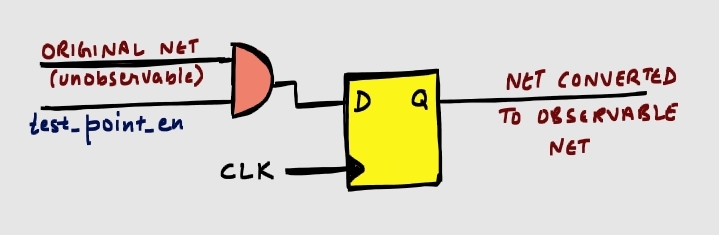 TPs are inserted to tackle above problems. They are essentially two kinds : control-points and observe-points (used for the same purpose as their name suggests). The structure of TPs may slightly vary depending on the tools used for DFT insertion, but the outcome is similar. Most common tools used in the industry for DFT insertion are: DFT Compiler (by Synopsys) and Tessent DFT tools (by Siemens).